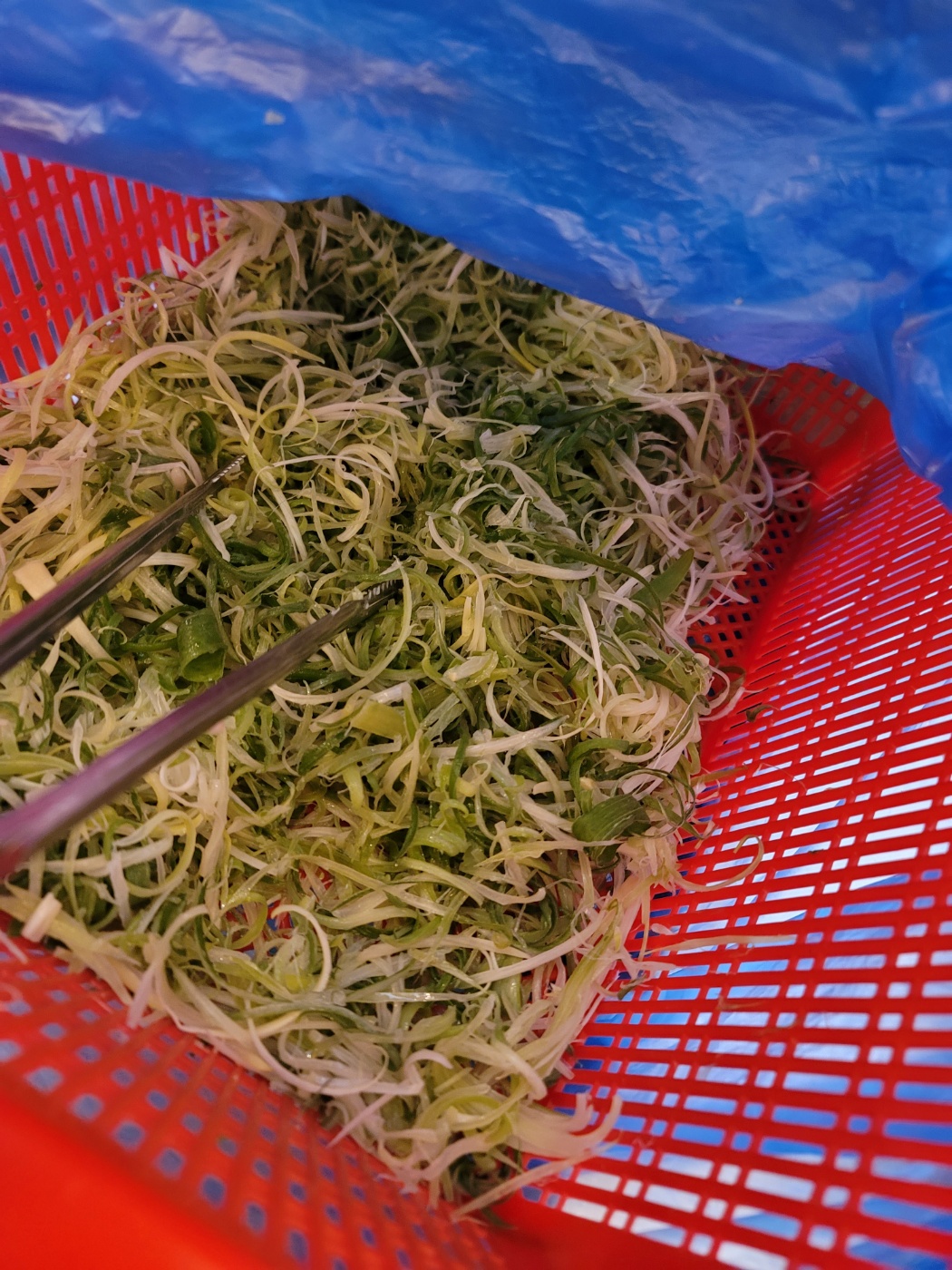 기름을 냈으니 두 번째는 콩나물이랑 마늘이랑 김치 싸악