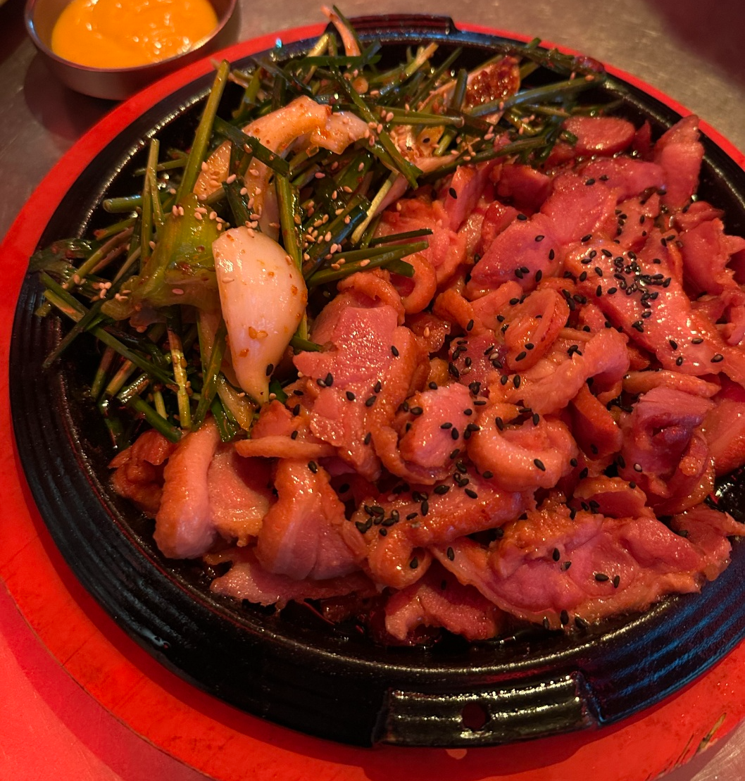 메인안주 중에서는 부추훈제오리구이를 시켰고